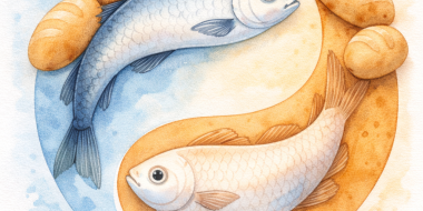 E ordinò loro di farli sedere tutti, a gruppi, sull’erba verde. E sedettero, a gruppi di cento e di cinquanta. Prese i cinque pani e i due pesci, alzò gli occhi al cielo, recitò la benedizione, spezzò i pani e li dava ai suoi discepoli perché li distribuissero a loro; e divise i due pesci fra tutti.